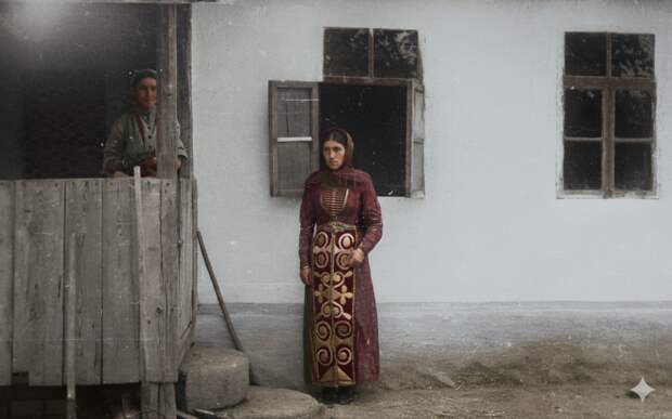 Черкешенка в традиционном праздничном костюме. Старая деревня Лескен, Кабарда, 1947 год. Адыгэ пщащэ хабзэ фащэ щыгъыу. Лэскэн къуажэжь, Къэбэрдей, 1947 гъэ.
